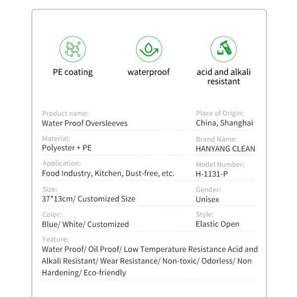 HYXT-PE Waterproof Sleeve Covers feature a PE-coated polyester fabric for superior liquid/oil protection. Available in white/blue (solid or dual-tone), they are lightweight, durable, and ideal for food processing or household tasks. Easy to clean and designed for comfort.